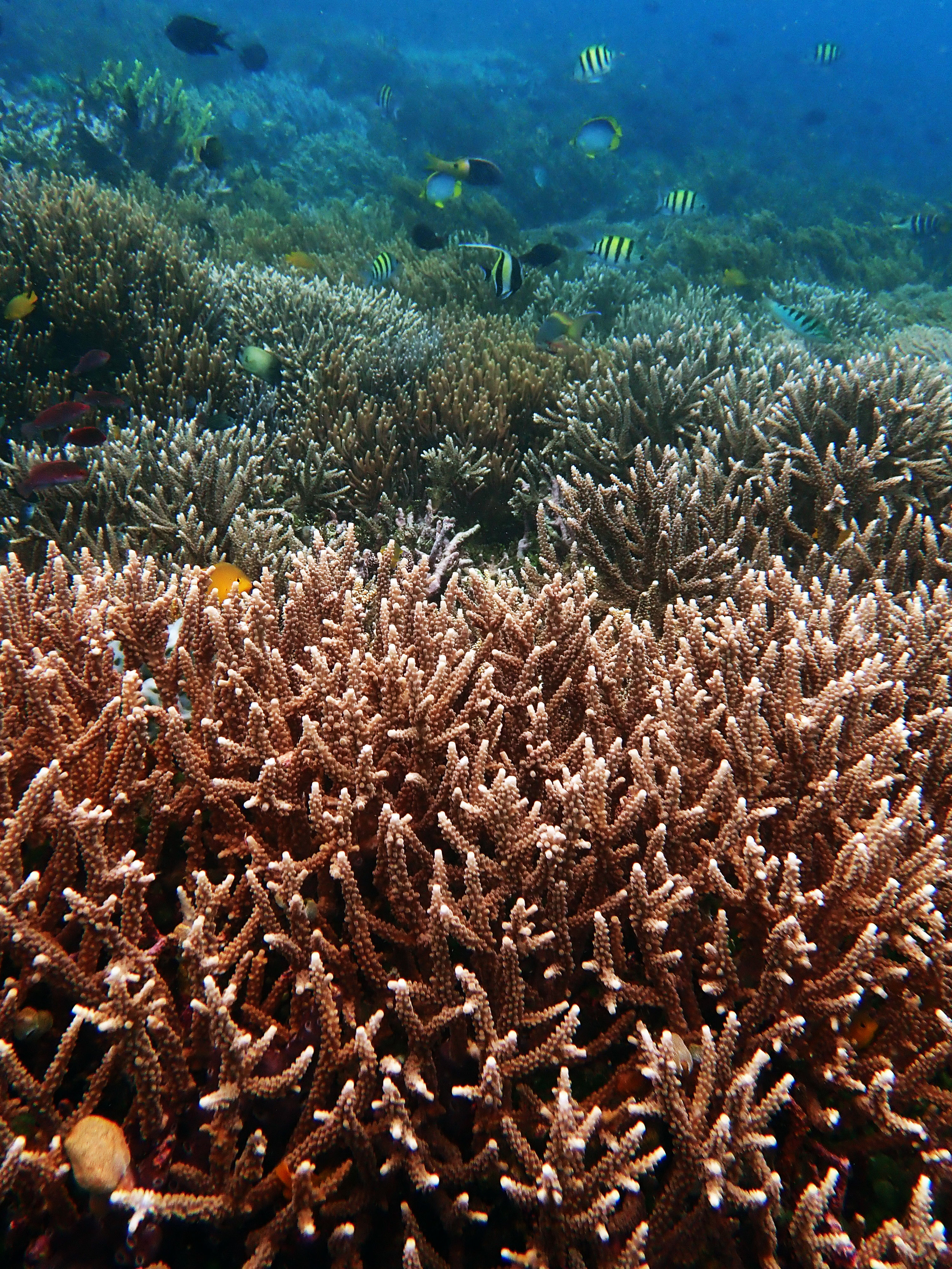 Dive site notes: A ripping current dive. We kept getting swept off the main wall part of the reef, but we eventually encountered corals (hard and soft) as we drifted along. 10-m viz. 24-25ºC. We actually had to relocate after 1-2 minutes to find a place with less current. Seriatopora caliendrum and Stylophora pistillata among most common corals at site. Most were fluorescent green or normal yellow/orange (not as many were bleached, as at the previous site). Reef ended at 15-17 m in most places, but extended down to 25-30 m in one particularly lush area. The deep wall was very complex with nice, hard coral cover (20-40%, maybe higher in areas). High density and diversity of small reef fish, though only a few large snapper were seen. Cool white crab living in soft coral (totally camouflaged). Reef ended in sand so struggled to stay on it. Eventually started drifting and encountered acres upon acres of soft corals interspersed with seriatoporids and acroporids. Finally reached large chunks of hard coral again. Soft coral was prevalent in abundance at all depths. Tubastrea, Pocillopora acuta, Isopora, beautiful, mixed hard+soft coral community at 5-6 m. Some small poritids and large Acropora spp. colonies at 3-4 m. Sergeant majors by the thousands. Reached a pier at whose base was a beautiful hard+soft coral garden going down past 10 m.